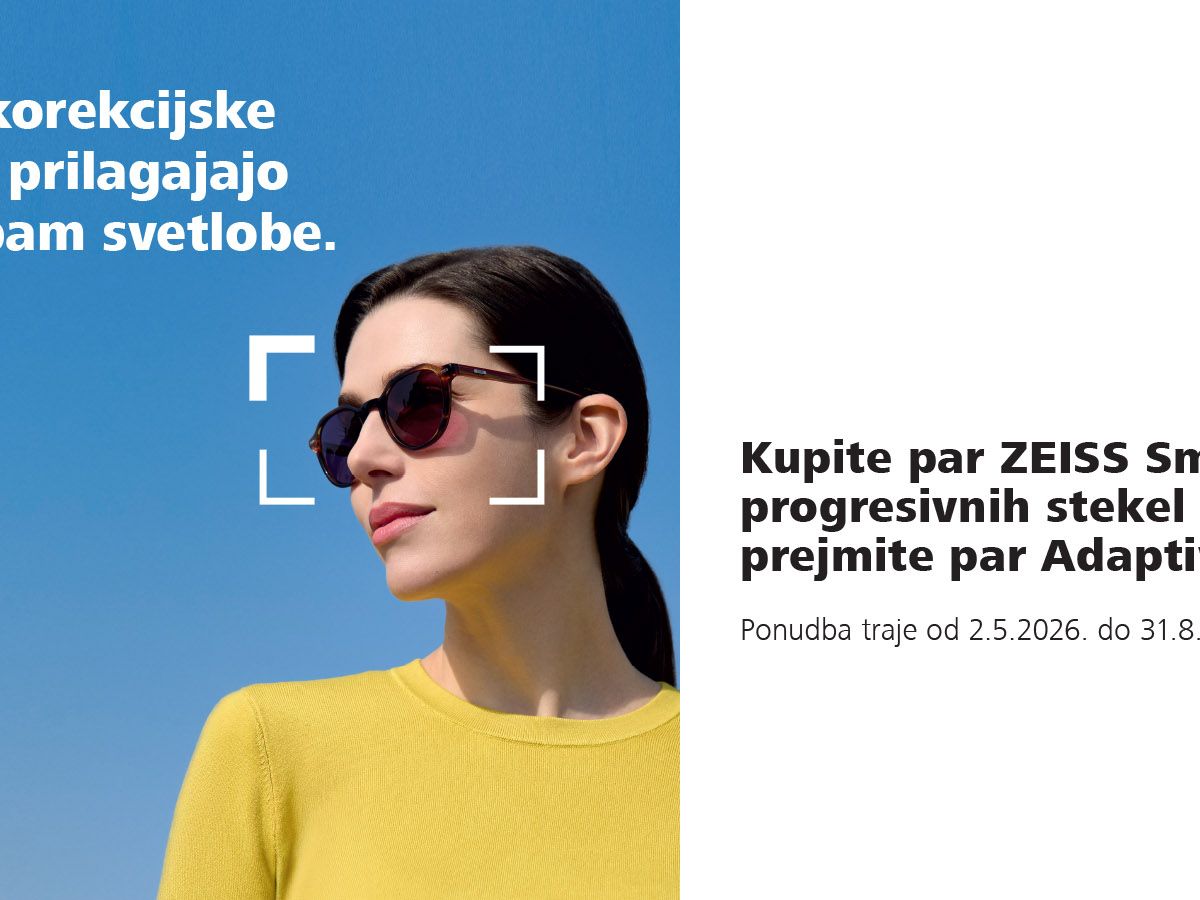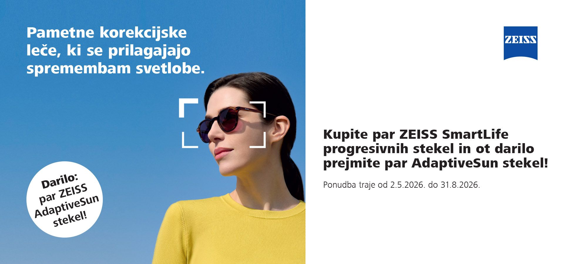 V okviru posebne promocijske akcije, od 2. maja do 31. avgusta 2026, ob nakupu izbranih ZEISS progresivnih očalnih leč prejmete darilo: